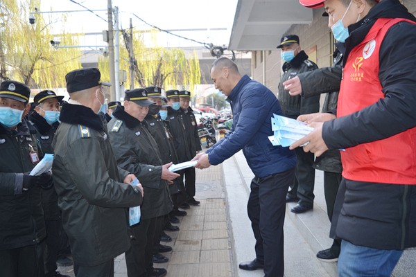 在活动筹备期间,爱心人士王明臣无私捐赠了1000只爱心口罩。“谢谢您,辛苦了,每天在室外奔波,带着口罩抵御下灰尘,请多多保重身体”,当他把两包爱心口罩递到巡防队员童师傅手中并送上贴心的问候,“谢谢你们爱的信任,我们会更加努力工作的”,童师傅手拿着口罩说,之后两个人的手紧紧握在了一起。
